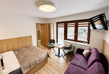 Opis pokoju: Pokój typu studio składa się z sypialni oraz dodatkowego pomieszczenia z wygodną rozkładaną kanapą, które...